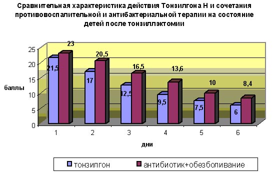 Дети всех возрастных групп хорошо переносили данную методику лечения [5]. Применение тонзиллгона в послеоперационном периоде ускоряет процесс заживления, у пациентов быстрее ликвидируется болевой синдром, уменьшаются воспалительные явления в глотке (см. Таблицу 1).